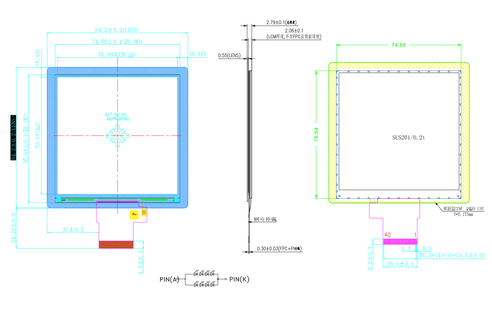 | आयामी रूपरेखा | 74.66 (डब्ल्यू)*76.54 (एच)*2.11 (टी) | बैकलाइट एलईडी | 8 पीसी |